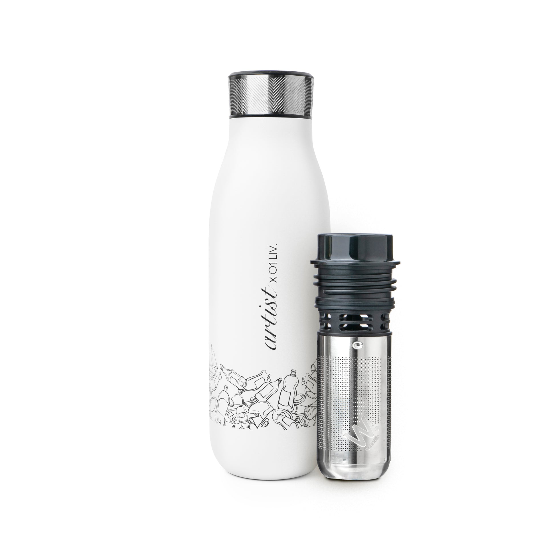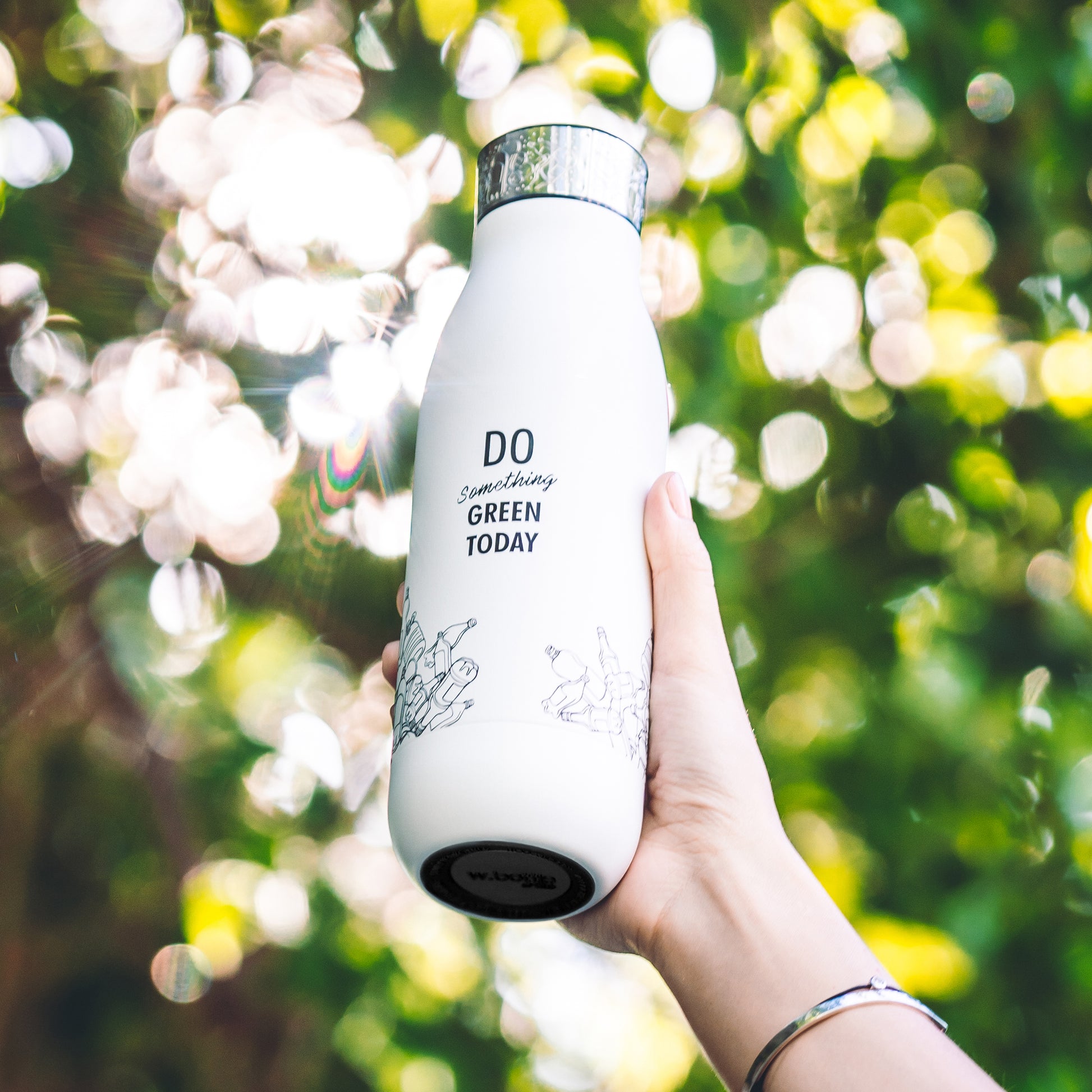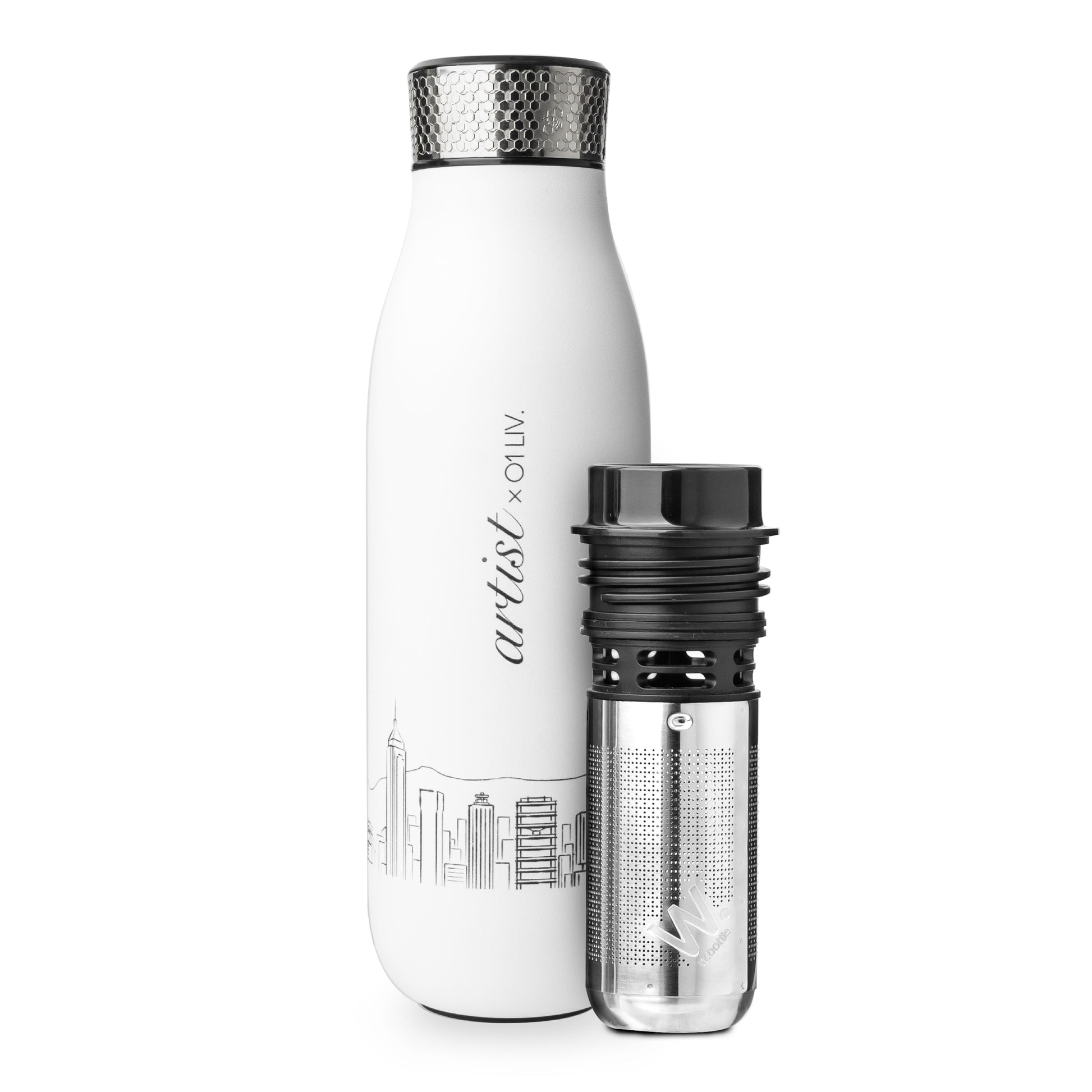 Reusable water bottle, thermal flask in Frosted White. A pristine and delicate color that embodies the serene cleanness of the sustainable world.