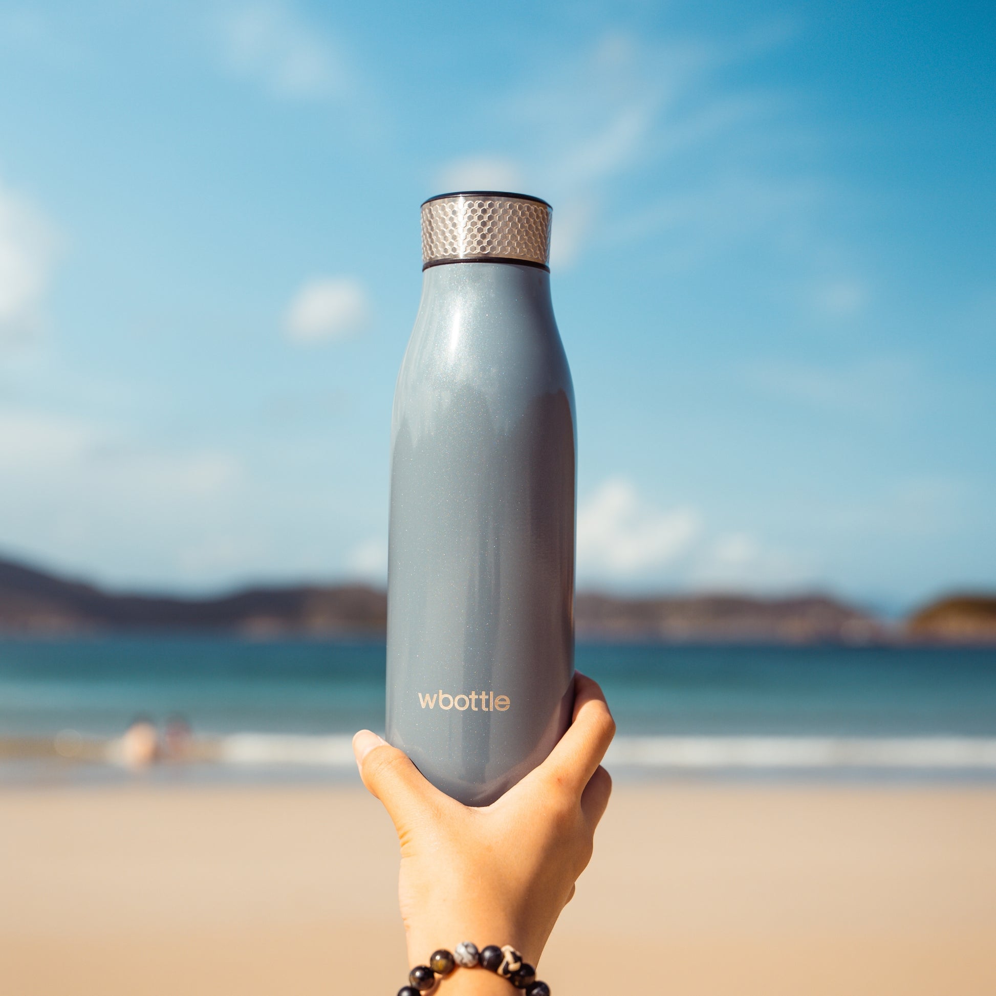 Reusable water bottle, thermal flask in Shiny Grey. Radiates a polished and modern aesthetic like a grey tie.